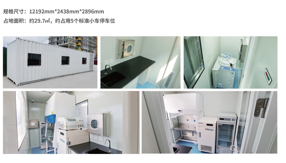 存放占地面积30mi左右。应急时可作为车载实验室使用,运到疫情发生地时简单调试即可使用。