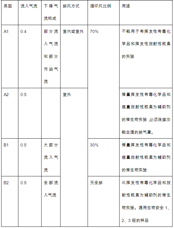 Ⅱ级安全柜按排放气流占系统总流量的比例及内部设计结构分为A1、A2、B1、B2四种类型。