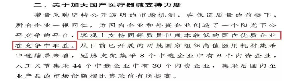 国家医保局表示,大量采购在保证质量的前提下,所有企业一视同仁。在这个公平竞争的平台上,客观上支持同等质量但成本较低国内优质企业在竞争中取胜。