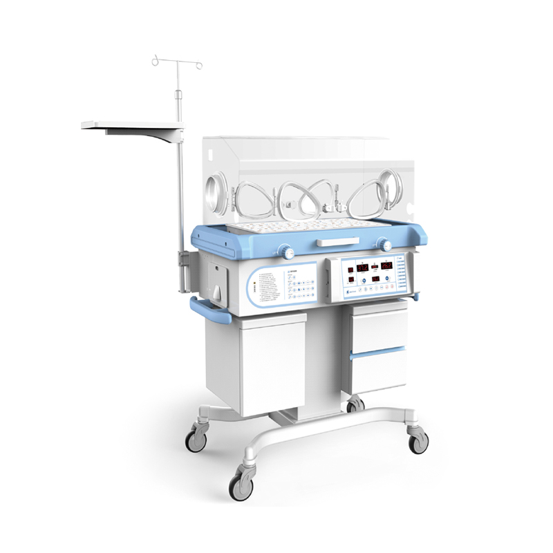婴儿培养箱主要部件由主机(包含婴儿舱、机箱、控制箱、输液架及托盘)、传感器盒、皮肤温度传感器、机座(机柜或升降式机柜)、辐射灯箱(黄疸治疗装置)(可选配件)和称重装置(可选配件)等组成。