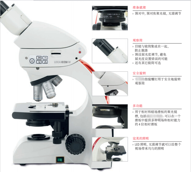 - 集成的电源线包装避免了不当电源线包装对显微镜组件造成的损坏;垂直电源线插入可以防止电源线在保存或使用时部分脱离支架。