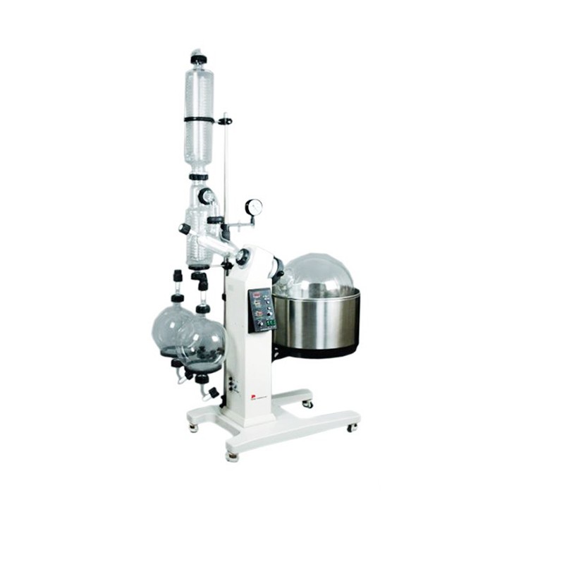 旋转蒸发器是在真空负压条件下,利用恒温加热,薄膜蒸发的原理研制而成。旋转蒸发器用无级调速使玻璃旋转瓶恒速旋转,物料在瓶壁形成大面积均匀薄膜,再由智能恒温水浴锅对旋转瓶均匀加热,在真空条件下高速蒸发,溶媒蒸气经高效玻璃冷凝器冷却,回收于收集瓶。